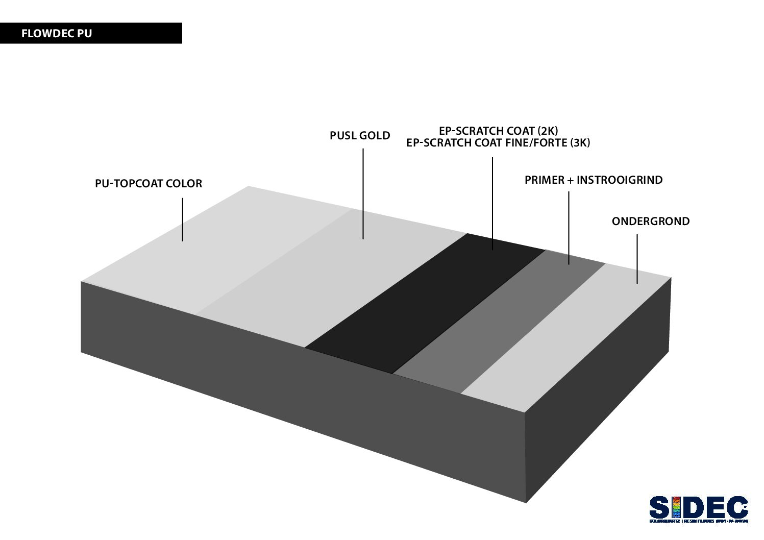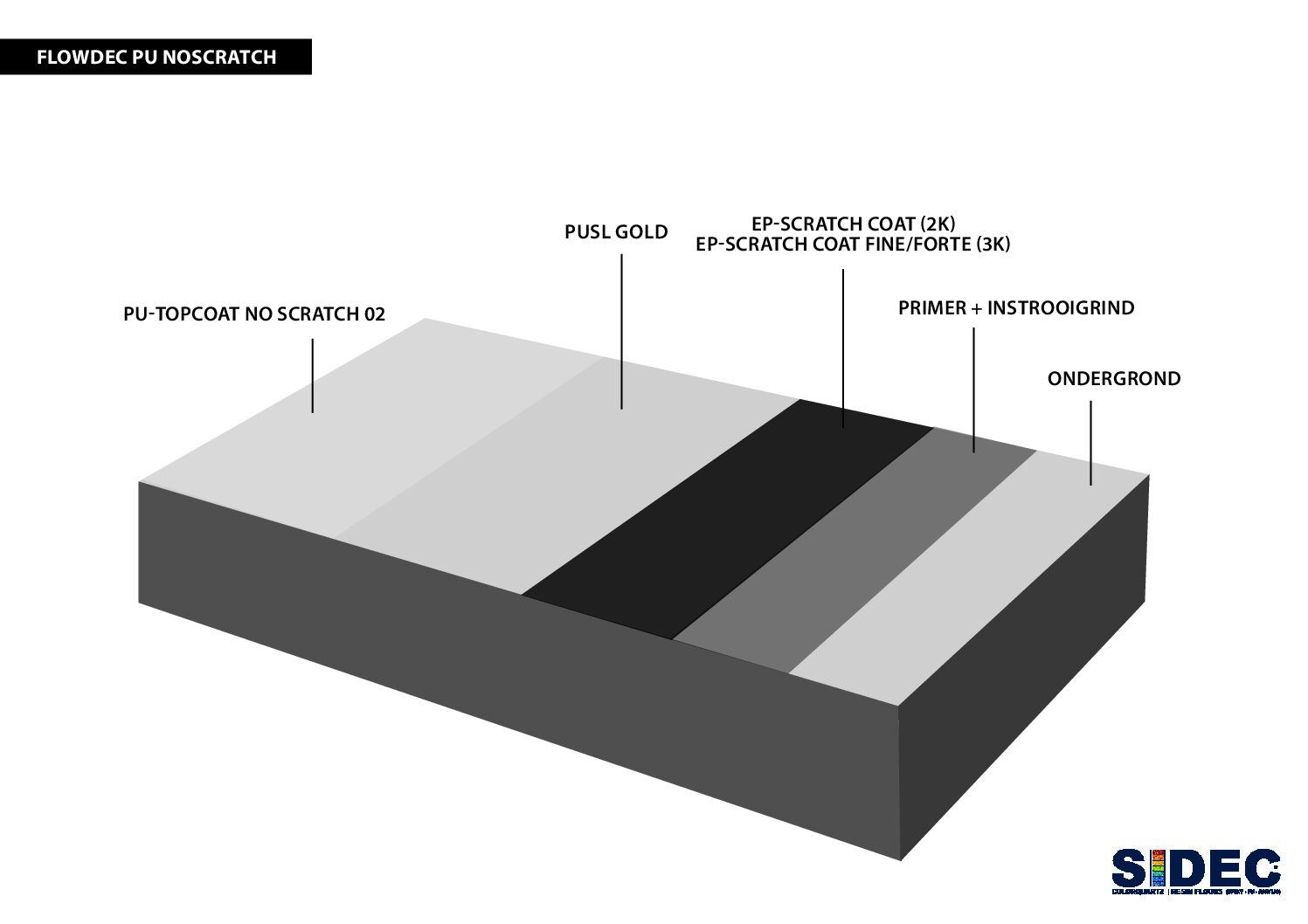 De Flowdec PU NoScratch wordt voorzien van een extra topcoat. Deze gekleurde vernis , is verkrijgbaar in de meeste Ral-kleuren. Doordat deze kleurcoating een lichte structuur (minimaal reliëf) heeft is hij super kraswerend, wat maakt dat dit de perfecte afwerking is voor gietvloeren die wat intenser gebruikt worden.