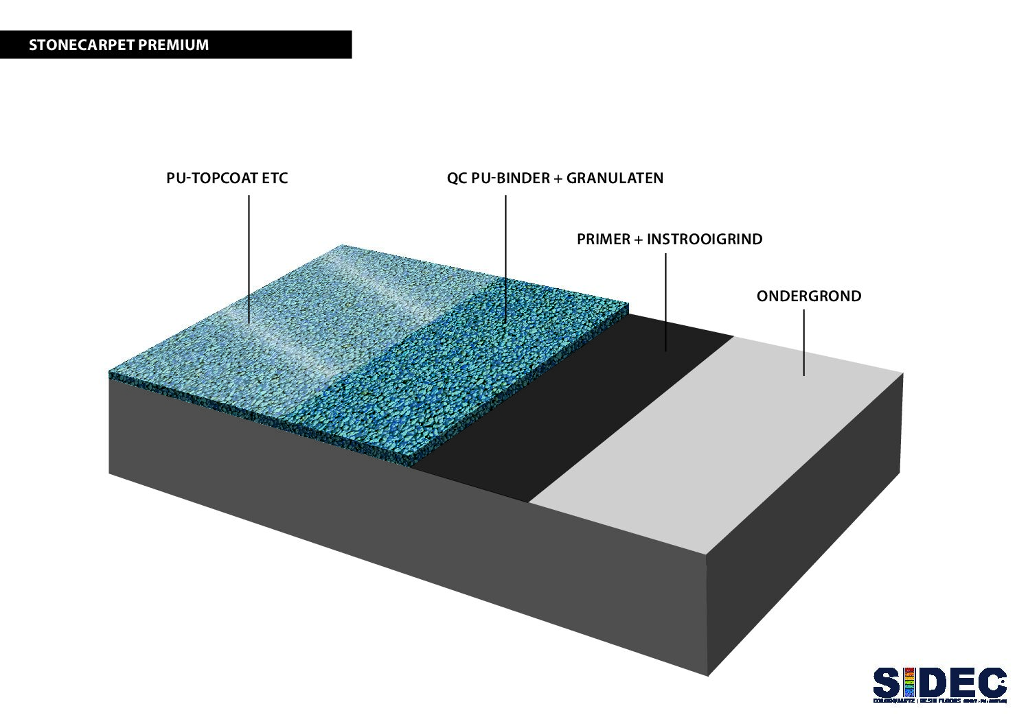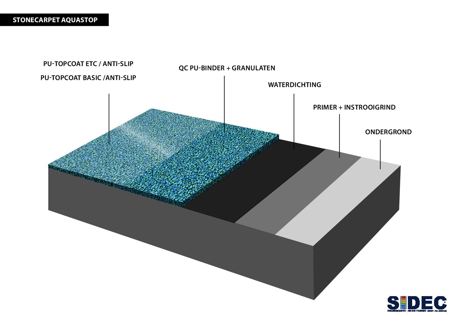 Deze vloer bestaat uit 3 of 4 lagen : primer – waterdichtingslaag – marmertapijt – anti-slip topcoat (optioneel). De minimale inbouwhoogte van dit systeem is  10 mm of 14 mm afhankelijk van de gekozen korrelgrootte. De primer dient gekozen te worden in functie van het type ondergrond. Om het u gemakkelijk te maken hebben we onder downloads een document toegevoegd zodat u zelf heel eenvoudig kan zien welke primer voor u de meest geschikte is.